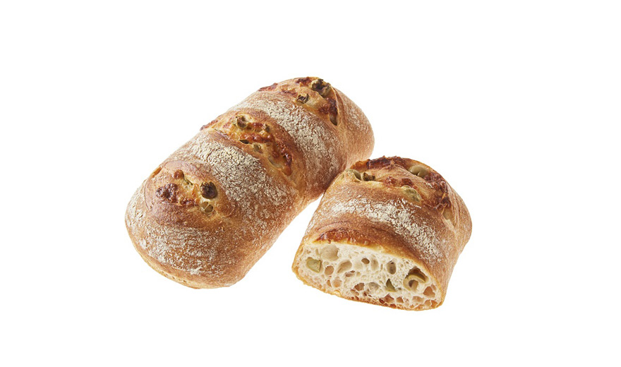 ファーマーズブレッド生地にグリーンオリーブとモッツァレラチーズを巻き込んで焼き上げました