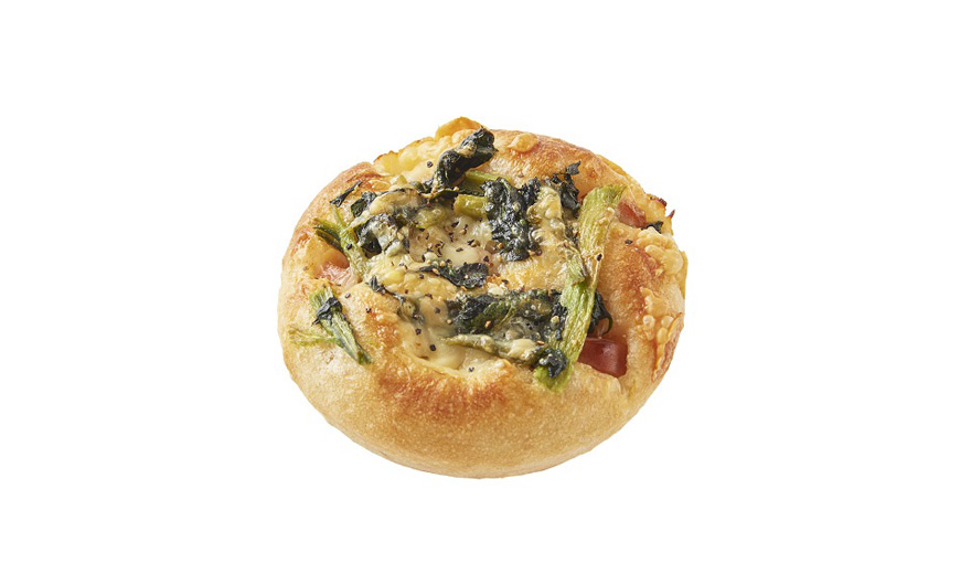 じゃがいも入りのファーマーズ生地に、バターフィリングと和えたほうれん草、ソーセージ、ミックスチーズを組み合わせました。
