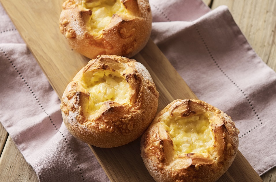 クリームチーズ、ミックスチーズを包んで焼き上げ、バターフィリングを絞りました。
