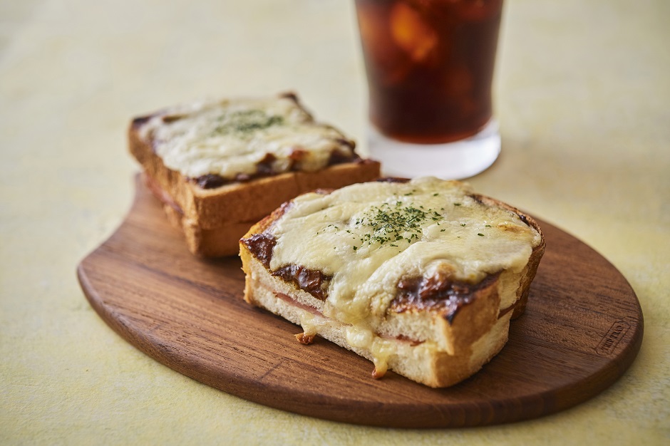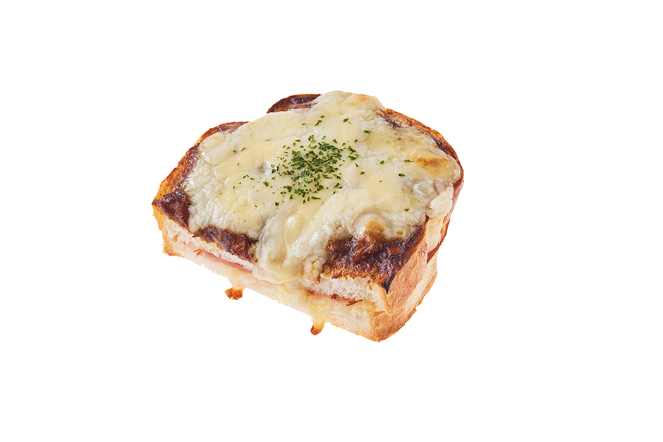 スライスしたイギリスパンで、グラタンソース、ポークシュゼットハム、ミックスチーズをはさみ、上にはミートソース、ミックスチーズをトッピング。仕上げにオリーブオイルを塗っています。