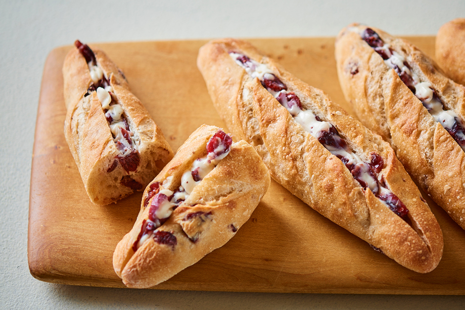 クランベリーのパンの生地をスティック状に焼き上げ、ドライクランベリー入りのクリームチーズフィリングを絞りました。旨みのあるファーマーズブレッド生地に、クランベリーの酸味とクリームチーズの味わいがマッチ。ブレイクタイムはもちろんのこと、サラダと合わせてランチにもおすすめの商品です。
