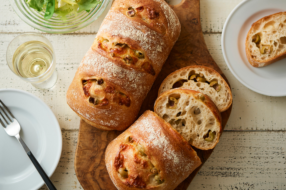 ファーマーズブレッド生地にグリーンオリーブとモッツァレラチーズを巻き込んで焼き上げました。