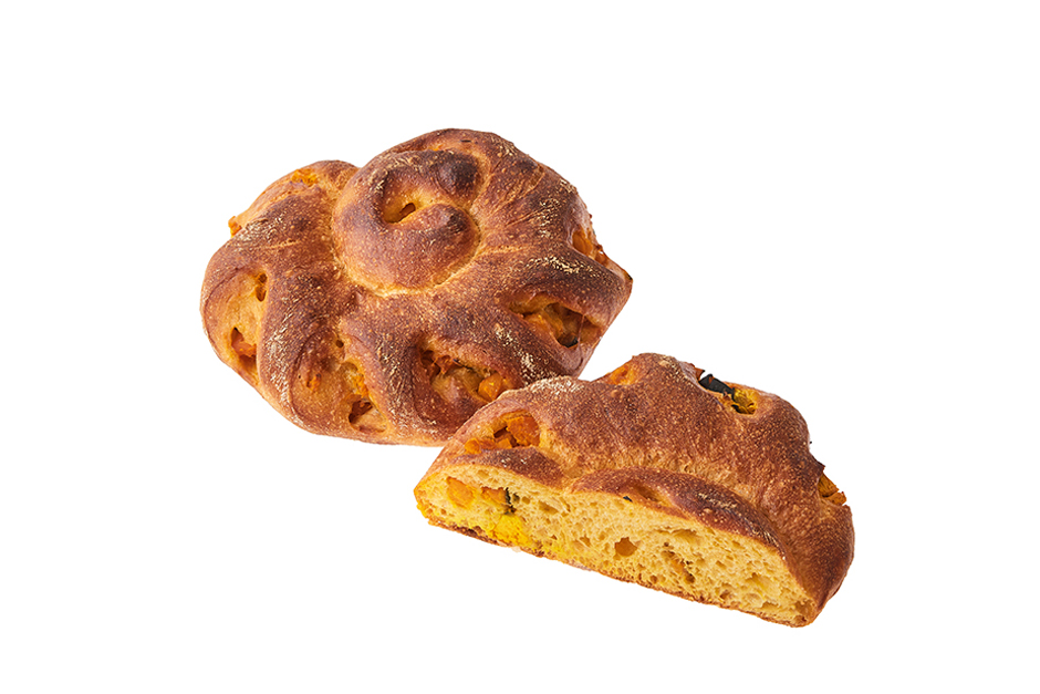 角切りの北海道産のかぼちゃにブラウンシュガーをまぶし、かぼちゃを練り込んだ生地に巻き込んで焼き上げました。ほくほくとしたかぼちゃと、かぼちゃを練り込んだしっとりとした生地の一体感で、どこを食べてもかぼちゃのおいしさが感じられます。