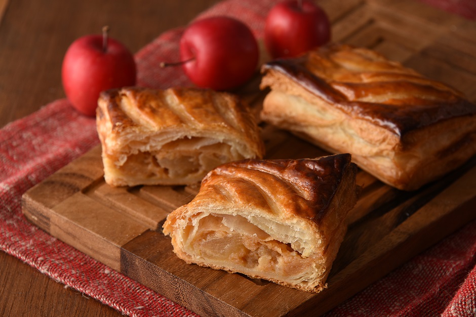 パイ生地に、紅玉りんごプレザーブとシナモン、カスタードクリーム、シフォンケーキを混ぜたフィリングを包んで焼き上げました。オーソドックスなタイプのアップルパイです。