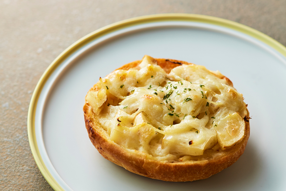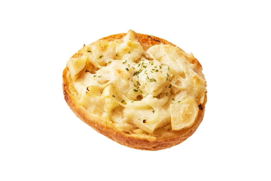 ハイジの白パンを横からカットし、細切りポテトマスタードフィリングを全体に塗り広げ、カットした皮付きポテト、オニオンスライスをのせ、チーズを混ぜたグラタンベースを絞り焼き上げました。細切り、厚切りのじゃがいもの2種類のじゃがいもの食感、味わいが楽しめます。ボリューム感があり、一つで満足感のあるおいしさです。リヒートすると、ハイジの白パンが軽い食感になり、サクッと一層おいしくいただけます。