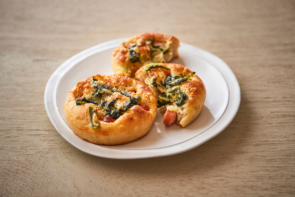 じゃがいも入りのファーマーズ生地に、バターフィリングと和えたほうれん草、ソーセージ、ミックスチーズを組み合わせました。仕上げにオリーブオイルをぬり、ブラックペッパーをふっています。