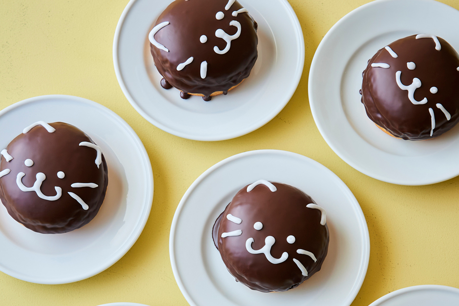 菓子パン生地にマジパンを包んで焼き上げ、生クリーム入りのカスタードクリームを絞り、チョコでコーティングしました。樽たたきのねこにちなみ、ねこの顔をデザインしています。