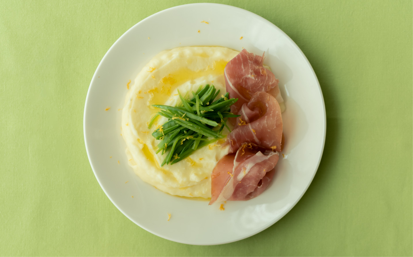 ①ピュレ状になったらお皿に盛り、生ハム、絹さやをのせてオリーブオイルをまわしかけ、レモンの皮をけずったら、できあがり。