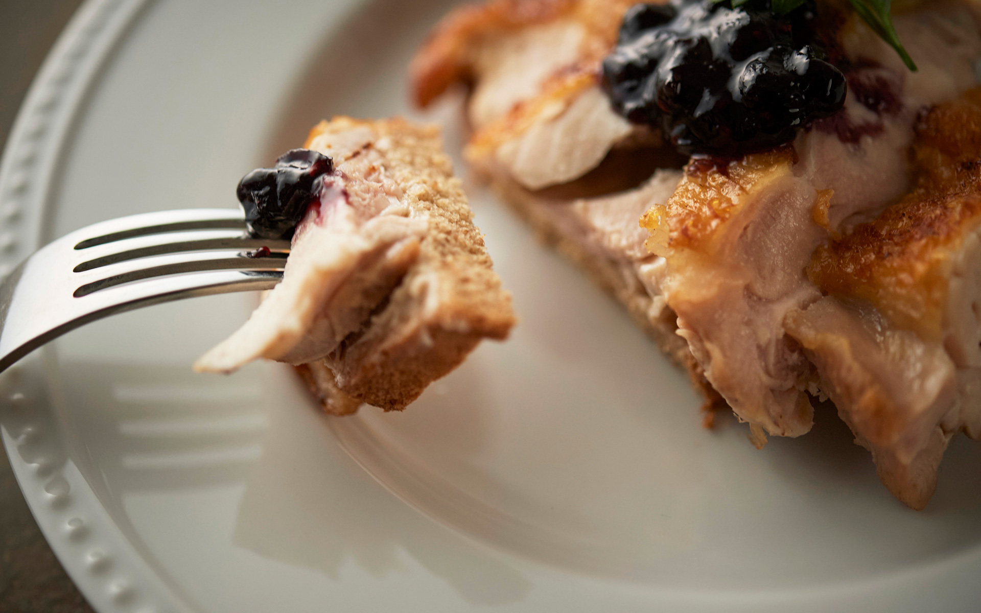 ③②の上にブルーベリーソースをかけて、イタリアンパセリで飾ったら、できあがり。