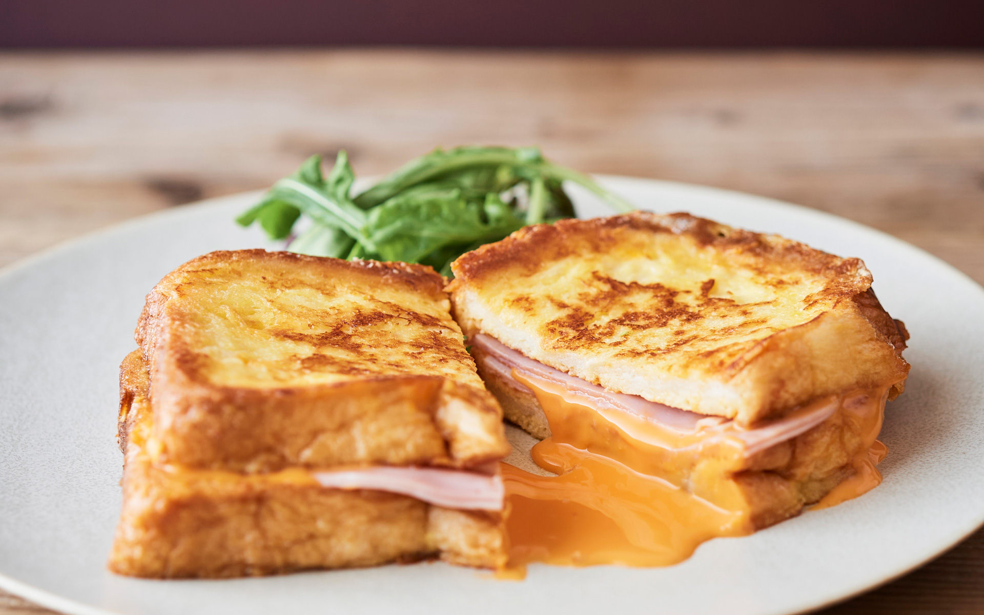 ハムとたっぷりのチーズをはさんで、塩こしょうで味付けしたアパレイユに浸したイギリスパンを焼きました。...